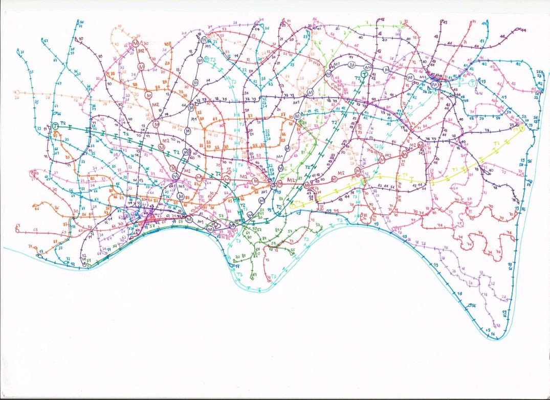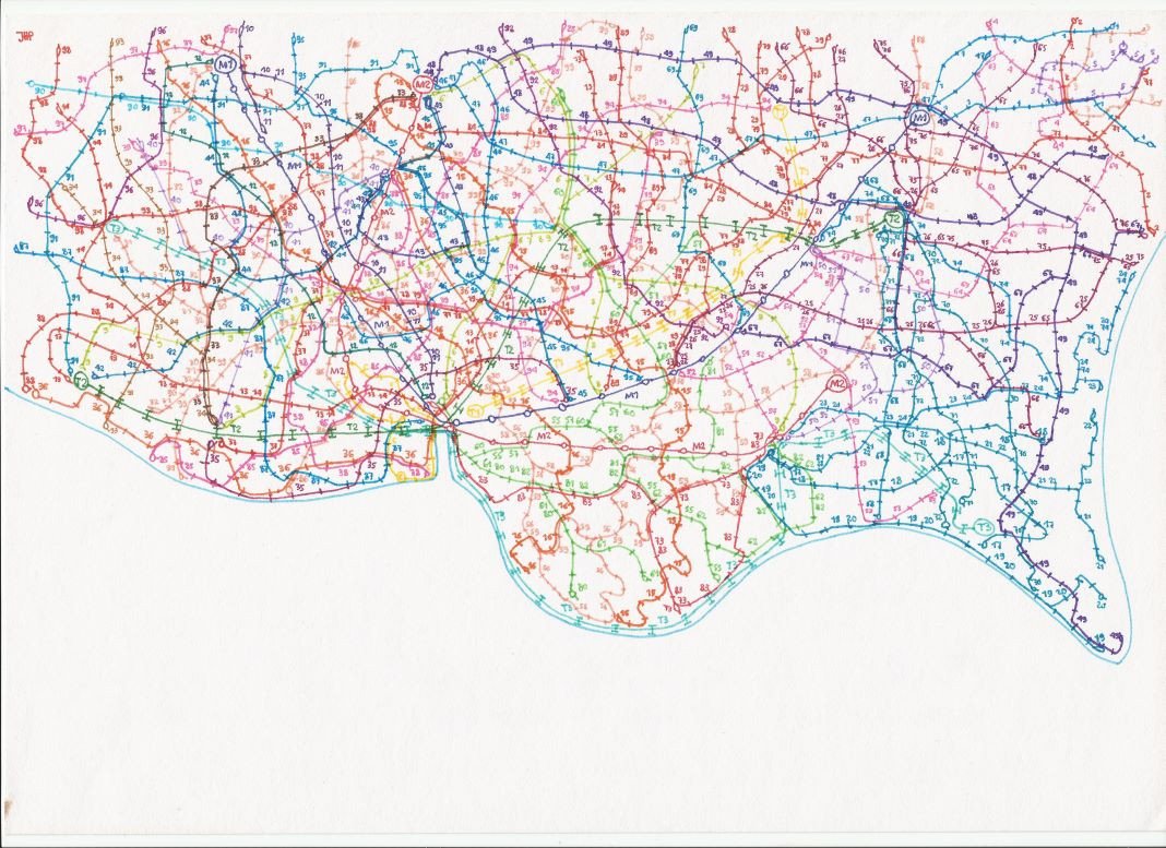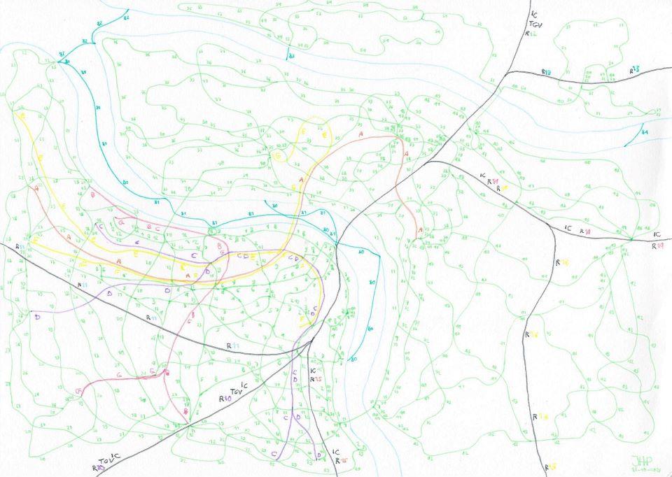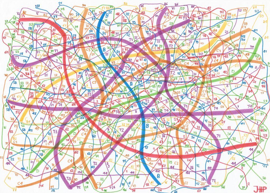 Artistieke plannen van het openbaar vervoer in Franse steden. Deze tekening is in de collectie van Musée de la Création Franche. Ze gebruiken het voor hun advertenties en publicaties, zoals voor de tentoonstelling in Talence (Bordeaux), eind 2025.